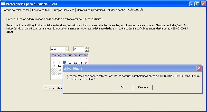 4) Uma mensagem de confirmação aparecerá: pense bem antes de confirmar ! Você não poderá retornar aos limites horários estabelecidos antes da data em questão, mesmo com a senha !