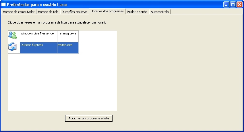 Graça a nosso programa, você pode estabelecer as faixas horárias de uso de seu programa de email, seja Outlook, Outlook Express ou ainda Live Messenger... Por exemplo, você pode escolher consultar seus e-mails somente durante a semana e das 14h às 15h apenas. Para isso: